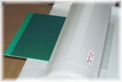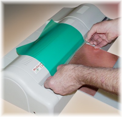 Feed the carrier (or copperclad) into the laminator and let about 1/2" pass between the rollers. If you are using a Modulam laminator, step on the footswitch to stop the feed motor. Fold the photopolymer film back over the top of the laminator and position the copperclad substrate up against the raised lip of the carrier.