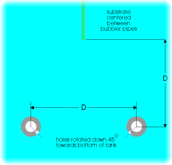 Locating the sparging manifoldGenerally speaking, the sparging manifold should be situated below the substrate a distance equal to the separation of the two bubbler pipes. In the case of both bubble assisted etchers and acid copper plating tanks, 3" (76mm) works quite well. The result is very uniform agitation along the entire height and width of the PCB being processed. If you will be plating boards with a vertical extent greater than 12" (305mm), increase the value of "D" to 4" (102mm) to insure adequate uniformity of agitation as the bubbles rise to the surface.NOTE: Since the entire sparger manifold will be filled with air during operation, it iwill tend to float to the top of the tank. To prevent this, you will need to add ballast the assembly. This can be accomplished by filling a couple of 6" (153mm) sections of ½" schedule 80 PVC pipe with lead shot (or fishing weights) and capping them off with pipe caps. Secure these weights to the center of each side of the manifold with stainless steel pipe clamps, being careful not to block any of the bubbler holes. The ballasts can also to glued in place using PVC solvent cement. |