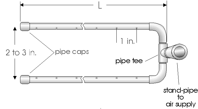 Assembling an air sparging manifoldOnce the actual bubbler sections have been drilled, they are ready for assembly into a complete sparging manifold. The design shown below will insure that the depletion regions that forms on both sides of your board are thoroughly disturbed. The holes along each pipe are actually on the bottom side of the sparger. They are shown for reference only. |