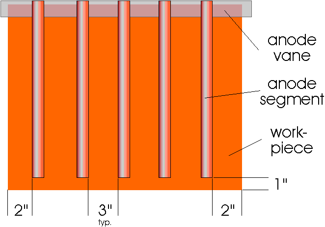 Side view of mounted anode array![]() Setting the anode segments back from the edges of the panel minimizes the excessive buildup of metal on the edges. ![]() |