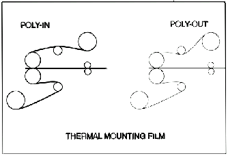 Two Passes This two pass operation requires pressure sensitive laminating film on the top supply shaft and pressure sensitive mounting film on the bottom supply shaft or thermal laminating film on the top and thermal mounting film on the bottom.