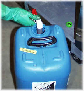 - Put on your acid proof smock and gloves and a facemask (or a pair of safety glasses with full side shields).