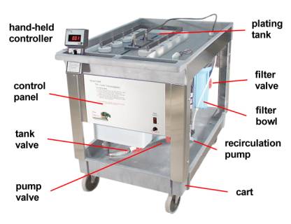 Tin/Lead Electroplating Module-Overview/Cart Components Overview Your Think & Tinker GC18-4000 Tin / Lead electroplating system has been thoroughly tested at the factory. Although the unit arrived at your facility completely assembled, there are a few things that you need to do to get it ready to use. There are a number of possible configurations for the cart based systems so some of the sections below may not apply to your unit. Plating Cart Components ![]() Tin/Lead Electroplating Cart Fig. 1 ![]() Recirculation/Filtration Fig. 2 The corrosion resistant cart is molded from polyethylene and polypropylene. Stainless steel trim and structural panels eliminate sagging and increase the load carrying capacity to well over 500 pounds (228 kg). Heavy duty casters allow the cart to be moved to any location in your shop so that work flow can be altered to adjust to your changing needs. The primary purpose of the cart is to act as a mobile mounting platform for all of the components needed to make a self contained electroplating system. These components / capabilities include: